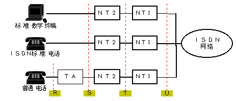 TA:終端適配器,完成非標(biāo)準(zhǔn)設(shè)備到ISDN速率的匹配及協(xié)議轉(zhuǎn)換(它可以在TE2中內(nèi)嵌實(shí)現(xiàn));以上各類設(shè)備間的連接接口稱為參考點(diǎn)(見(jiàn)下圖):