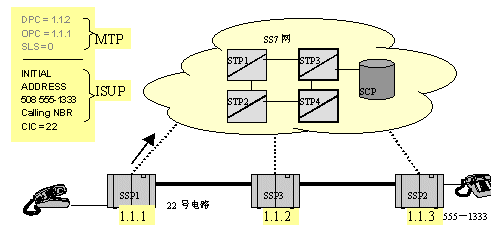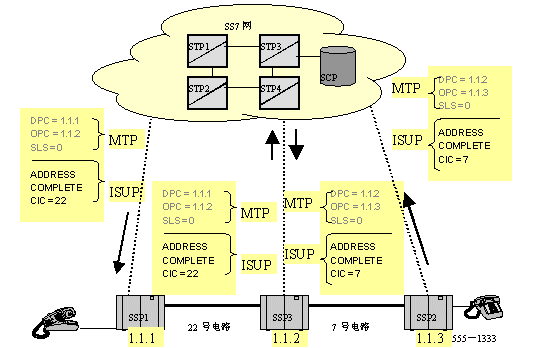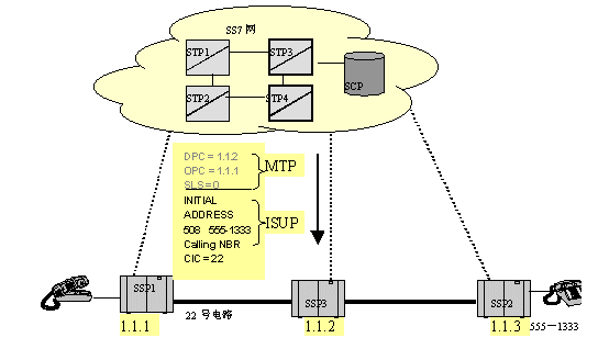 如下圖所示,當(dāng)一個用戶摘機并拔被叫號碼,交換局(SSP1)收集并分析被叫號碼,分析到被叫不是本局內(nèi)用戶,而是目的信令點編碼為1.1.3交換局的用戶,于是,SSP1在路由表中查找到達1.1.3的路由,然后用找到的鏈路把IAM消息發(fā)送出去,如圖中箭頭所示。