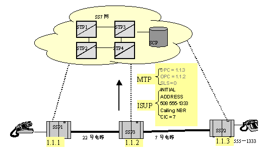當(dāng)消息(IAM)到達路由中下一個交換點1.1.2時,MTP層再次分析路由。在1.1.2中,MTP查找目的信令點編碼,并發(fā)現(xiàn):這個消息不是發(fā)給自己的,然后就找出轉(zhuǎn)發(fā)這個消息的路由及具體的鏈路。