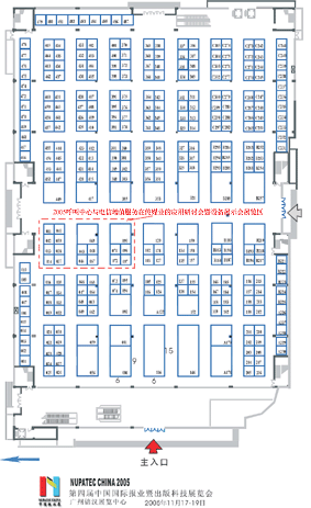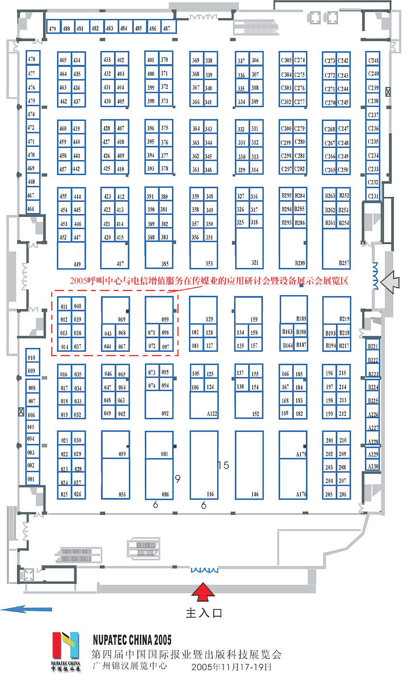 (圖中紅顏色邊框區(qū)為2005呼叫中心與電信增值服務在傳媒業(yè)的應用研討會暨設備展示會展覽區(qū))