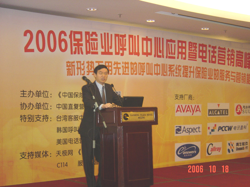 。。2006年10月18日,2006保險(xiǎn)業(yè)呼叫中心應(yīng)用暨電話營銷高峰研討會在北京天鴻科園大酒店隆重召開,以下是大會開幕致辭的相關(guān)圖片報(bào)道: