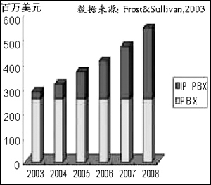 這幾年,IP電話(huà)的需求在不斷升溫,尤其在2003年呈快速增長(zhǎng)趨勢(shì)。目前,全球IP電話(huà)市場(chǎng)容量每年為10億美元,預(yù)計(jì)到2008年,IP電話(huà)的市場(chǎng)份額將超過(guò)傳統(tǒng)的PBX。據(jù)思科公司溫帶策經(jīng)理介紹,思科在前4年,向全球銷(xiāo)售了100萬(wàn)臺(tái)IP電話(huà),而在2003財(cái)年僅僅一年時(shí)間里,就銷(xiāo)售了100萬(wàn)臺(tái)IP電話(huà)。IP語(yǔ)音系統(tǒng)將于2008年超過(guò)PBX