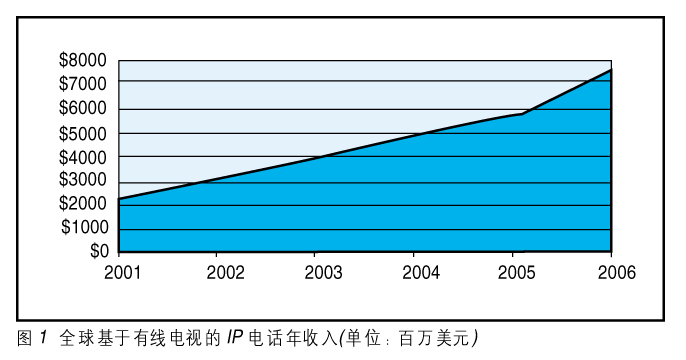 有線電視運(yùn)營(yíng)商在尋找使用有線電視基礎(chǔ)網(wǎng)絡(luò)HFC的新服務(wù),創(chuàng)造新的經(jīng)濟(jì)增長(zhǎng)點(diǎn),提供數(shù)據(jù)、語音、圖像綜合的服務(wù)。基于有線電視系統(tǒng)的IP電話將是第一個(gè)最有可能推出的新服務(wù)。2002年InStat/MDR的分析報(bào)告說2006年基于有線電視的IP電話網(wǎng)將達(dá)到US$75億的年收入,如圖1所示。