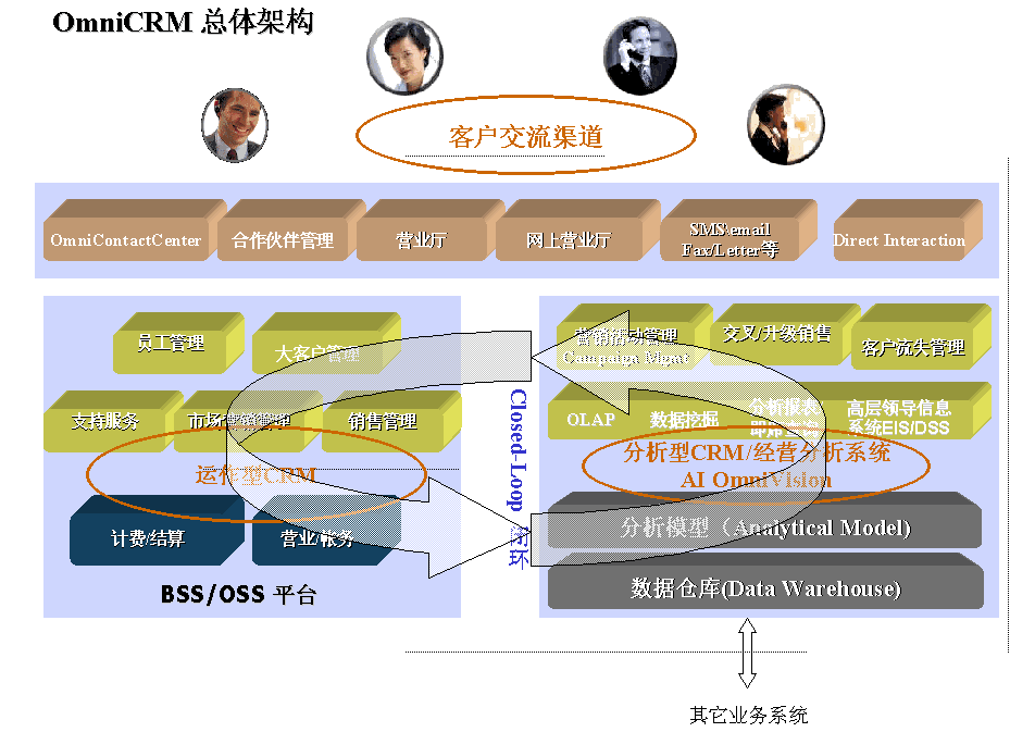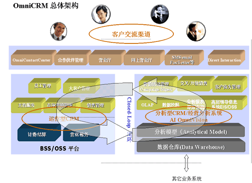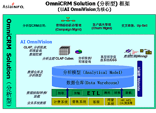 OmniCRM方案是亞信基于多年服務(wù)電信市場(chǎng)的豐富的行業(yè)經(jīng)驗(yàn),以及對(duì)國內(nèi)運(yùn)營(yíng)商業(yè)務(wù)發(fā)展的深刻認(rèn)識(shí)而推出的,其中,AI OmniVisionOmniCRM方案中經(jīng)營(yíng)分析型CRM 的核心產(chǎn)品。AI OmniVision不僅符合行業(yè)業(yè)務(wù)規(guī)范,而且基于對(duì)客戶行為、競(jìng)爭(zhēng)環(huán)境,商業(yè)獲利率以及其他參數(shù)的透徹分析,能夠使運(yùn)營(yíng)商充分了解現(xiàn)有客戶、識(shí)別并關(guān)注贏利的客戶組、提高服務(wù)質(zhì)量、確?蛻魸M意度和忠誠度;同時(shí)吸引潛在的客戶;加強(qiáng)提供新服務(wù)的投資回報(bào)率;提高效率、減小成本,以實(shí)現(xiàn)業(yè)務(wù)價(jià)值的最大化。AI OmniVision采用數(shù)據(jù)倉庫、ETLOLAP分析、靈活報(bào)表展現(xiàn)及數(shù)據(jù)挖掘等技術(shù),包含了用戶分析、業(yè)務(wù)分析、收益分析、大客戶分析、營(yíng)銷分析、競(jìng)爭(zhēng)分析、服務(wù)質(zhì)量、新業(yè)務(wù)分析等眾多功能模塊。
