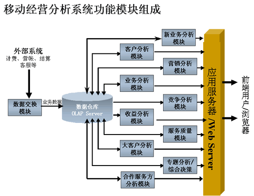 根據(jù)中國移動(dòng)的業(yè)務(wù)特征,AI OmniVision分為用戶分析、業(yè)務(wù)分析、收益分析、大客戶分析、營(yíng)銷分析、競(jìng)爭(zhēng)分析、服務(wù)質(zhì)量分析和綜合決策分析。同時(shí)在系統(tǒng)中還需要一些輔助模塊,以保證系統(tǒng)正常順利地運(yùn)行。這些輔助模塊包括:
