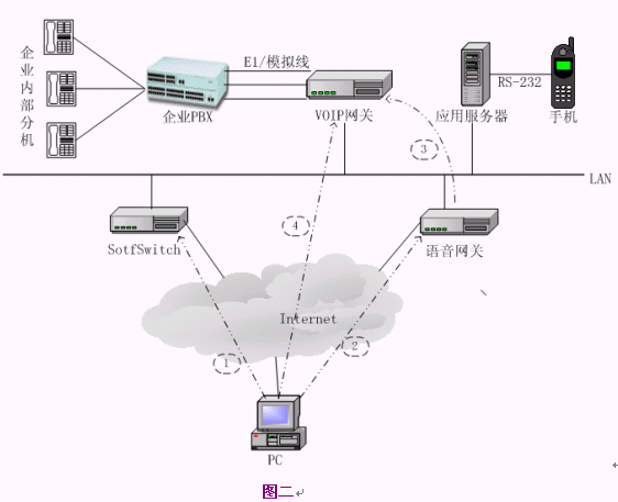 用戶使用系統(tǒng)時,需要先下載終端并安裝到PC上,然后在終端上撥企業(yè)內(nèi)部的分機號碼就可以了。對于一般的企業(yè),VoIP語音網(wǎng)關可以配置幾條模擬線到一個E1的規(guī)模,SoftSwitch、語音網(wǎng)關、應用服務器可以安裝在一臺PC或PC服務器上,或者與企業(yè)的其它服務器(如代理服務器)合用,另外需要一到兩個公網(wǎng)IP地址資源。系統(tǒng)的硬件和網(wǎng)絡成本非常低,整個系統(tǒng)如果按一個E1(30路)容量計算,配置VoIP網(wǎng)關和一臺PC服務器,硬件價格不超過3萬元,如果VoIP網(wǎng)關支持隧道模式傳送信令和語音,則語音網(wǎng)關也可以省去。