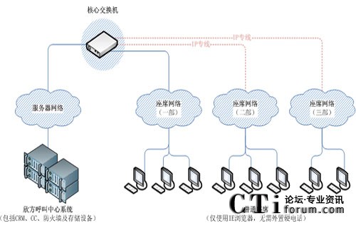 河北博岳呼叫中心職場分為1個中心職場和2個分部,之間相隔幾公里至幾十公里,以VoIP通路連接,所有職場統(tǒng)一管理,最大程度的適應了呼叫中心建設的個性化需求,同時,這種布局還大大降低了租用場地的成本,也方便話務員就近上班。
