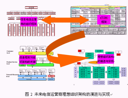 現(xiàn)有的電信運營商的管理架構(gòu)向理想的管理組織架構(gòu)演進過程中,要涉及到不同的中間過程和步驟,對中間過渡狀態(tài)的評估和有效實現(xiàn),是實現(xiàn)演進的關(guān)鍵,F(xiàn)有組織架構(gòu)管理職能的對應,業(yè)務流程的標準化,管理流程的標準化,企業(yè)IT支撐架構(gòu)對業(yè)務職能部門的支撐,這些環(huán)節(jié)都是運營商應該重點考慮的中間內(nèi)容。圖2顯示了未來電信運營商理想組織架構(gòu)的演進與實現(xiàn)過程。其中的任何一個環(huán)節(jié)都是電信運營管理研究的核心課題,也直接影響到了電信運營管理變革的成敗。