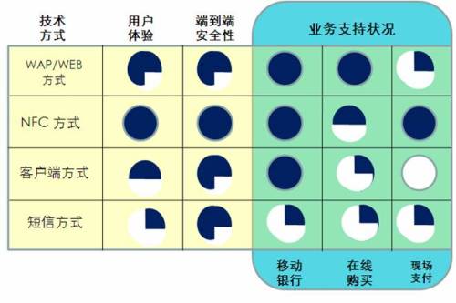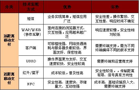 移動支付(Mobile payment)包括遠距離方式和近距離方式。遠距離移動支付的主要技術實現(xiàn)方式有SMS、WAP、客戶端(手機軟件)和USSD;近距離移動支付的主要技術實現(xiàn)方式有紅外和NFC。各種移動支付業(yè)務技術實現(xiàn)方式優(yōu)劣勢比較詳見圖表1。CTI論壇報道