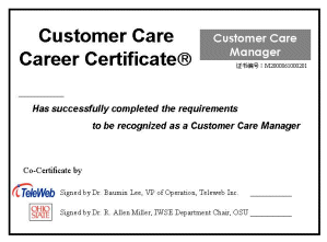 學(xué)員在經(jīng)過完整的課程培訓(xùn)之后,經(jīng)考試合格,可以獲得由美國俄亥俄州立大學(xué)與太維資訊有限公司聯(lián)合頒發(fā)的的專業(yè)培訓(xùn)證書?蛻舴⻊(wù)中心認(rèn)證的目的有兩個:首先,對于已經(jīng)在客服中心從業(yè)的人員,太維公司的培訓(xùn)可以提供一個提升他們工作能力的機(jī)會,通過培訓(xùn)后不同層次的專業(yè)培訓(xùn)認(rèn)證,太維公司以行業(yè)的標(biāo)準(zhǔn)要求對他們的提升加以證明,以加強(qiáng)他們在行業(yè)中的競爭能力。其次,對于有志致力于在客戶服務(wù)行業(yè)從業(yè)的人事,太維公司廣泛深入、滿足各種需求的專門技術(shù)培訓(xùn)與相應(yīng)的不同層次的認(rèn)證,為他們進(jìn)入該行業(yè)提供一個標(biāo)準(zhǔn)的素質(zhì)證明,以使他們能夠順利勝任客戶服務(wù)中心的各種主要的工作職位。