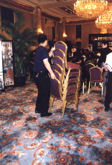 大會工作人員正在為來賓臨時增加椅子