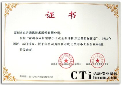 CTI論壇(ctiforum)4月6日消息(記者 潘婷婷):由深圳市政府大力支持,深圳市科工貿(mào)信委、深圳市中小企業(yè)服務(wù)中心,深圳市統(tǒng)計局,深圳大學管理學院聯(lián)合組織評測的“深圳市成長型中小工業(yè)企業(yè)500強”,于3月31日被正式認定,深圳市東進通訊技術(shù)股份有限公司榮列其中。今后,作為深圳市中小企業(yè)成長工程的重點培育對象,東進技術(shù)將獲得政府公共資源的傾斜扶持,促進加快發(fā)展,形成“示范效應”。圖:東進技術(shù)榮獲“深圳市成長型中小工業(yè)企業(yè)500強”證書
