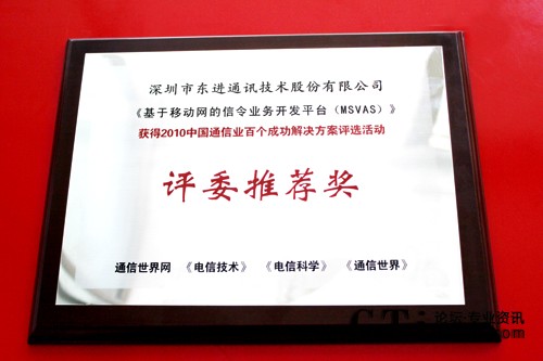 從2010年7月起評選進入征集階段,經(jīng)過長達3個月的層層篩選,最終百個成功解決方案出爐,并由多家主流媒體公示。東進技術(shù)“基于移動網(wǎng)的信令業(yè)務開發(fā)平臺(MSVAS)”解決方案憑借出眾的實用經(jīng)濟性、安全可靠性、靈活性和成熟性,經(jīng)過兩個月網(wǎng)絡初選,和近百位運營商層面專業(yè)人士組成的組委會技術(shù)終選后獲此殊榮。