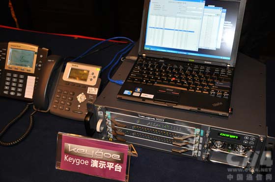 現(xiàn)場兩套演示系統(tǒng)中,一套以Keygoe 3000系列機(jī)箱承載最新研發(fā)的高密度VoIP資源處理板PFBT480X,實現(xiàn)整機(jī)最大1920路VoIP語音處理,展示了keygoe 3000多媒體交換機(jī)在大容量IP呼叫和語音處理的卓越性能。另一套則展示了最新的Keygoe1001系列多媒體交換機(jī),該機(jī)通過內(nèi)置主控CPU板,將語音交換、語音處理以及應(yīng)用程序整合在一個高為1U的物理機(jī)箱中,為中小型規(guī)模業(yè)務(wù)應(yīng)用提供具有較強(qiáng)綜合性、靈活性和完整性的運營平臺。