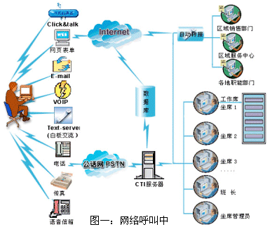 星際(杭州)網(wǎng)絡技術有限公司(www.ebanswers.com)在調查中發(fā)現(xiàn),隨著信息技術的發(fā)展,消費者在客戶服務上提出了更高的要求。在接入渠道上,他們希望既可以通過電話、傳真接入,也可以通過網(wǎng)絡接入;在方式上,既可以通過語音接入,又可以通過各類文字交流。星際網(wǎng)絡推出的網(wǎng)絡呼叫中心正是這樣一種呼叫中心的延伸與完善,如圖一所示。與傳統(tǒng)呼叫中心相比,網(wǎng)絡呼叫中心具有三大特點:首先,網(wǎng)絡呼叫中心整合了現(xiàn)有的所有客戶接入渠道,包括電話、傳真、網(wǎng)上文字交流、Email、Web call等,為客戶提供最寬暢的接入通道;其次,對于一個企業(yè)而言,它是企業(yè)各分呼叫中心的整合;最后,在服務流程的規(guī)范上,通過知識庫等輔助功能又可以統(tǒng)一服務口徑,提升企業(yè)形象。