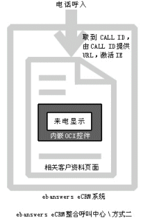 。。Ebanswers CRM整合呼叫中心的這種方式過程更清晰,當(dāng)有電話呼入系統(tǒng)時,由內(nèi)嵌的OCX控件取到call