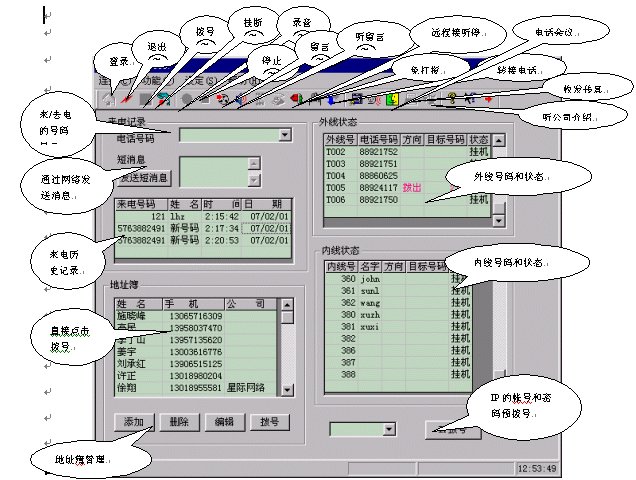 電話控制臺(tái)(軟電話),所有系統(tǒng)操作包括電話、查詢、短消息等等都可以通過鍵盤、鼠標(biāo)操作完成: