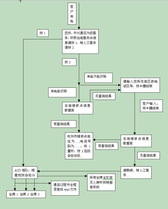 在中興通訊呼叫中心流程設(shè)計(jì)上充分體現(xiàn)了CTI技術(shù)以及數(shù)據(jù)庫技術(shù)等IT技術(shù)與星際先進(jìn)的管理理念的融合。該流程的設(shè)計(jì)保證將主動(dòng)提高服務(wù)品質(zhì)的工作集中于對(duì)呼叫者最重要的環(huán)節(jié)――對(duì)維修網(wǎng)點(diǎn)信息的咨詢上。它為所有呼叫者提供了詳細(xì)、精煉、基本的高品質(zhì)電話服務(wù),同時(shí)又根據(jù)電話區(qū)號(hào)提供了有針對(duì)性的咨詢服務(wù)。