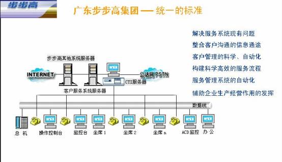 步步高呼叫中心最有效益的應(yīng)用就是在客戶服務(wù)管理系統(tǒng)中發(fā)揮前端強(qiáng)有力的支持作用,它不但給客戶提供高級(jí)的交互式服務(wù),而且為業(yè)界確定了新的客戶服務(wù)滿意標(biāo)準(zhǔn)。