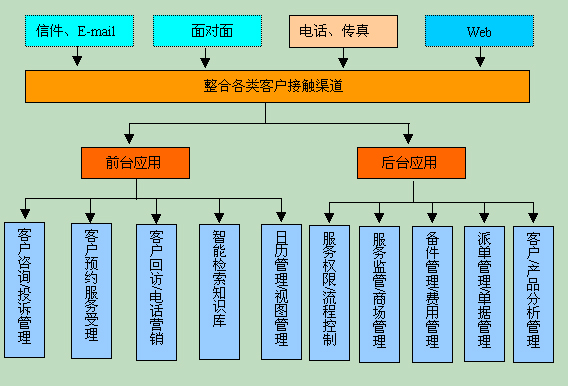后臺(tái)客服應(yīng)用子系統(tǒng)能夠很方便地與前臺(tái)呼叫中心整合,以更全面的功能,提供一流的客戶服務(wù)。整個(gè)后臺(tái)系統(tǒng)包括一系列完善的功能:客戶咨詢/投訴管理、客戶預(yù)約服務(wù)受理、客戶回訪/電話營(yíng)銷、智能檢索知識(shí)庫(kù)、日歷管理/視圖管理、服務(wù)權(quán)限/流程控制、服務(wù)監(jiān)管/商場(chǎng)管理、備件管理/費(fèi)用管理、派單管理/單據(jù)管理、客戶/產(chǎn)品分析管理。