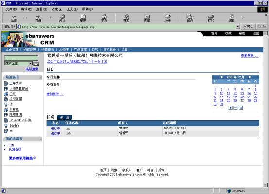 星際(杭州)網(wǎng)絡(luò)技術(shù)有限公司(www.ebanswers.com)研發(fā)的Ebanswers eCRM是中國第一套基于新一代網(wǎng)絡(luò)標(biāo)準語言――XML的客戶關(guān)系管理系統(tǒng),整個系統(tǒng)提供了完善的企業(yè)級客戶關(guān)系全面解決方案,包含可無縫整合又可獨立運行的三個功能組件:銷售,營銷,服務(wù)流程自動化軟件系統(tǒng);客戶溝通集成信息化方案;深層商業(yè)智能分析。