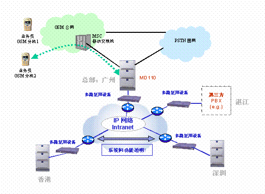同時,在公司總部, 用愛立信MD110替換原有交換機(jī),并與廣東移動直接相連,總部配180個設(shè)定不同的權(quán)限級別的ME(移動分機(jī)),使經(jīng)常在外辦理業(yè)務(wù)的人員的手機(jī)號被注冊為總部交換機(jī)的一個移動分機(jī)。廣東移動為所有移動分機(jī)提供特殊價格。