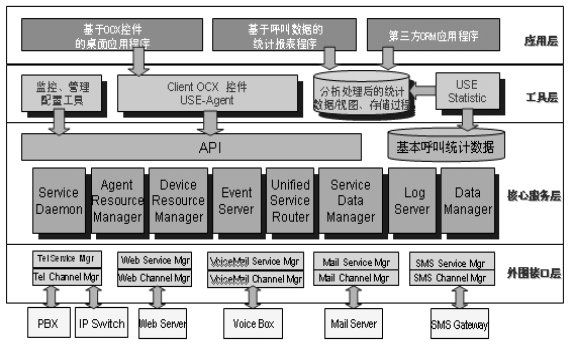 青牛USE從體系結(jié)構(gòu)上分為四個層次。第一層為外圍接口層,負責(zé)接入、抽象和發(fā)布來自不同渠道的服務(wù)請求;第二層是核心服務(wù)層,它是青牛USE軟件的核心部分,對來自不同渠道的服務(wù)請求和服務(wù)回復(fù)進行統(tǒng)一的服務(wù)排隊管理、資源調(diào)度管理、日志數(shù)據(jù)管理等,屏蔽了不同渠道的物理特性,真正實現(xiàn)統(tǒng)一路由、統(tǒng)一管理;第三層是工具層,是青牛USE提供給應(yīng)用開發(fā)商和集成商的開發(fā)接口和配置工具;第四層,USE產(chǎn)品的應(yīng)用層,為呼叫中心應(yīng)提供應(yīng)用功能,比如:呼叫統(tǒng)計分析、呼叫監(jiān)控等。