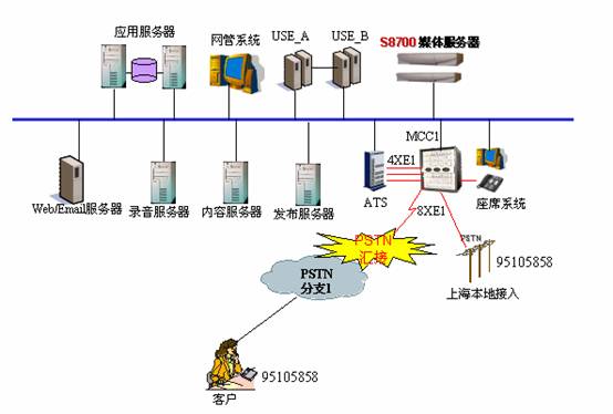 1、采用AVAYA的S8700作為排隊系統(tǒng),MCC1作為媒體網(wǎng)關(guān),全國280多個城市的客戶撥打本地電話通過電信網(wǎng)絡匯接到上海中心;