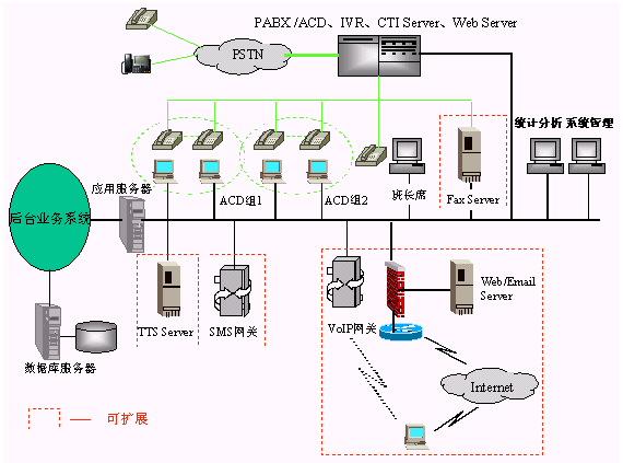 · 一個完整的呼叫中心解決方案通常由以下核心部分組成:自動呼叫分配(ACD)、交互式語音應(yīng)答(IVR)、計算機電話綜合應(yīng)用(CTI)、錄音服務(wù)器、呼叫管理(CMS)等。
