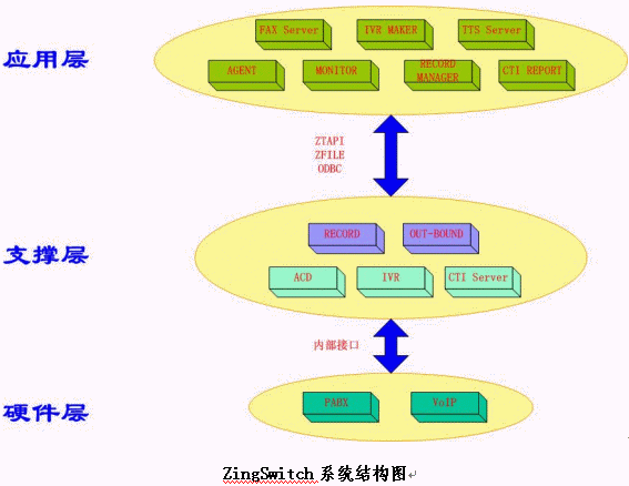 在以上三層結(jié)構(gòu)中,前兩層與具體業(yè)務(wù)系統(tǒng)無關(guān)。上層業(yè)務(wù)系統(tǒng)的多種變化,不會影響下層的穩(wěn)定;而下層規(guī)范地進(jìn)行優(yōu)化和擴(kuò)展后,上層的所有應(yīng)用都可在業(yè)務(wù)功能上得到擴(kuò)展。這樣,用戶的業(yè)務(wù)應(yīng)用系統(tǒng)自身可以有多種功能和性能的變動和擴(kuò)展,同時,當(dāng)基于ZingSwitch一體化交換機(jī)的呼叫中心系統(tǒng)平臺在進(jìn)行擴(kuò)容、升級的時候,原來已經(jīng)無縫掛接其上的用戶的業(yè)務(wù)應(yīng)用系統(tǒng)也無需任何更改即可運(yùn)行。