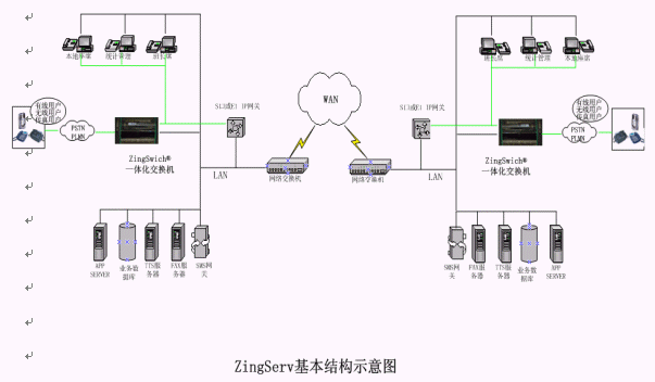 有ZingSwitch®端,使用E1接口或S口VoIP網(wǎng)關(guān)分別與ZingSwitch®交換機的E1數(shù)字中繼板或模擬中繼板CO8卡相連,通過本地LAN與WAN相連。無ZingSwitch®端,電信的E1線或模擬線直接與E1接口網(wǎng)關(guān)或O口網(wǎng)關(guān)相連,通過本地LAN與WAN相連。