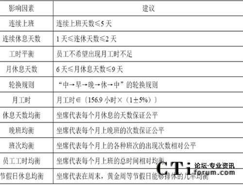 要滿足每半小時實際安排的座席數(shù)量不少于需要的座席數(shù)量的要求,首先就需要進行班次的設(shè)計,這是為第五環(huán)節(jié)資源規(guī)劃而準(zhǔn)備的。“班次設(shè)計”是指設(shè)計出一系列的班次,比如早班,中班,晚班,等等。而將來只要告訴員工,你下個月每天各上什么樣的班次即可。在班次設(shè)計時,需要充分考慮前面提到的一些影響因素:如下所示。