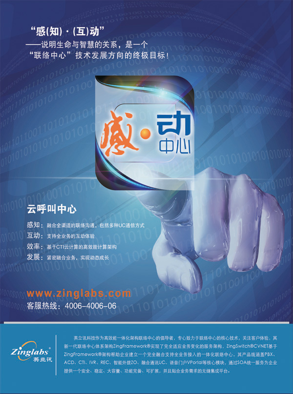 英立訊科技(Zinglabs)是國際領先的高效能一體化聯(lián)絡中心平臺及CTI解決方案提供商。一直秉承“創(chuàng)新設計、追求卓越”的理念,為其用戶和合作伙伴開創(chuàng)著一個無限豐富、靈活的平臺空間。英立訊科技的產(chǎn)品會幫助企業(yè)建立一個完全融合的支持全媒體接入的一體化聯(lián)絡中心,為企業(yè)提供一個安全、可靠、大容量、功能完備、可擴展,并且與企業(yè)業(yè)務系統(tǒng)無縫集成的技術平臺。公司專心致力于CTI領域,是專注于CTI技術并引領相關技術走向的聯(lián)絡中心平臺專業(yè)化廠商,在一體化架構聯(lián)絡中心產(chǎn)品的完善和提高方面不斷努力創(chuàng)新,為客戶定制隨需應變的聯(lián)絡中心平臺。