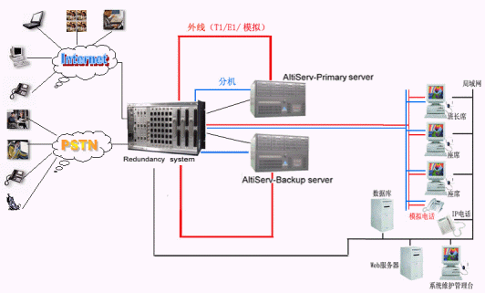 奧迪堅通訊系統(tǒng)有限公司作為CTI通訊平臺的提供商,在技術(shù)上不斷創(chuàng)新,對產(chǎn)品精益求精,尤其體現(xiàn)在對系統(tǒng)的運行安全性的要求上,為了防止電信接入設(shè)備或者企業(yè)網(wǎng)絡(luò)出現(xiàn)故障而造成的呼叫中心服務(wù)中斷,奧迪堅呼叫中心系統(tǒng)提供安全保護(hù)冗余切換系統(tǒng),來保障呼叫中心在意外情況下的正常工作,該安全冗余切換系統(tǒng)通過對電源、T1/E1、模擬trunk、分機(jī)座席、以及各種網(wǎng)絡(luò)鏈路串口等備份切換來實現(xiàn)可靠的運行。除此之外,奧迪堅系統(tǒng)本身也提供強(qiáng)大的安全保障,由于采用先進(jìn)IP內(nèi)核一體化設(shè)計,集傳統(tǒng)PBX、CTI服務(wù)器、IVR、ACD、Recording、FAX等眾多設(shè)備于一體,這樣有效的避免了因為外掛設(shè)備過多以及設(shè)備供應(yīng)商的不同而存在的兼容性的問題,從而降低了給呼叫中心系統(tǒng)帶來的的不穩(wěn)定的安全隱患。在系統(tǒng)之外依靠安全保護(hù)冗余切換系統(tǒng),可以實現(xiàn)外線、分機(jī)、以及各種鏈路接口的雙倍安全運行。如上圖所示:兩臺奧迪堅的呼叫中心服務(wù)器和奧迪堅安全冗余切換系統(tǒng)構(gòu)成呼叫中心熱備份系統(tǒng),在兩臺服務(wù)器中安裝所有的呼叫中心功能模塊。通常情況下由主呼叫中心服務(wù)器提供系統(tǒng)的正常運行,備份服務(wù)器通過安全保護(hù)冗余切換系統(tǒng)的服務(wù)監(jiān)測模塊來監(jiān)測主服務(wù)器的各項設(shè)備和鏈路的使用情況,當(dāng)主服務(wù)器遭遇突發(fā)故障不能繼續(xù)工作時,系統(tǒng)馬上實施自動切換,就會通過安全保護(hù)冗余切換系統(tǒng)將系統(tǒng)切換到備份的呼叫中心系統(tǒng)上來,此鏈路可以是數(shù)據(jù)、語音、網(wǎng)絡(luò)、串口等。當(dāng)安全保護(hù)冗余切換系統(tǒng)自身出現(xiàn)斷電或者其他故障時,所有鏈路均保持正常工作狀態(tài)。