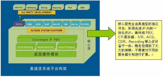 值得一提的是,在穩(wěn)定性上,奧迪堅IP一體化呼叫中心平臺系統(tǒng)構(gòu)架,從產(chǎn)品設(shè)計之初就突破了以住基于交換機(jī)或板卡的傳統(tǒng)模式,在一臺通訊服務(wù)器上高度融合了呼叫中心的所有常用功能,有效避免了復(fù)雜的網(wǎng)絡(luò)連接和眾多的各類交換機(jī)和外掛設(shè)備,各個設(shè)備相對獨立兼容性差所給呼叫中心系統(tǒng)所帶的穩(wěn)定性欠佳的隱患。除此之外,奧迪堅呼叫中心系統(tǒng)底層硬件模塊是在美國設(shè)計生產(chǎn)的,通過北美和中國的嚴(yán)格的電信入網(wǎng)測試;相對于硬件,平臺軟件也都是由奧迪堅自主開發(fā)設(shè)計的,針對不同的硬件采用不同的驅(qū)動模塊,軟硬一體在交換層又使用統(tǒng)一的邏輯接口,結(jié)構(gòu)清晰,層次合理,不僅保障了穩(wěn)定而且便于擴(kuò)展(如下圖所示),整個系統(tǒng)作為一個整體統(tǒng)一擴(kuò)展,不需要對不同的服務(wù)器分別進(jìn)行擴(kuò)展,有效避免了傳統(tǒng)呼叫中心構(gòu)建方式在擴(kuò)展方面存在的復(fù)雜性問題以及高額的擴(kuò)展費(fèi)用。