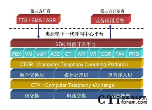 傳統(tǒng)型的語音交換機(jī)在設(shè)計(jì)之初,只側(cè)重于語音交換能力,并沒有考慮到呼 叫中心這種需要集成數(shù)據(jù)的應(yīng)用模式,因此基于傳統(tǒng) TDM 交換機(jī)的呼叫中心系 統(tǒng)都需要外掛 CTI 服務(wù)器,至于基于語音板卡、傳統(tǒng)型 IP-PBX 或軟交換的呼叫 中心系統(tǒng)也不例外。而奧迪堅(jiān) IP 呼叫中心平臺(tái)在設(shè)計(jì)伊始,就專門針對(duì)于呼叫 中心的應(yīng)用,在底層已經(jīng)將 PBX、CTI、IVR 等核心功能緊密地融合在一起了, 在系統(tǒng)集成度方面遠(yuǎn)遠(yuǎn)優(yōu)于傳統(tǒng) TDM 交換機(jī)、語音板卡、傳統(tǒng)型 IP-PBX 或軟 交換的解決方案。