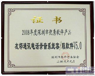 2009年1月,友鄰?fù)ㄓ嶋娫掍浺粝到y(tǒng)客/服軟件V5.0 榮獲由深圳市軟件行業(yè)協(xié)會(huì)頒發(fā)的“2008年度深圳市優(yōu)秀軟件產(chǎn)品”榮譽(yù)證書(shū)!2008年度深圳市優(yōu)秀軟件產(chǎn)品”的評(píng)選是深圳市軟件行業(yè)協(xié)會(huì)在全市范圍內(nèi)舉辦的軟件產(chǎn)品推優(yōu)活動(dòng),經(jīng)過(guò)了企業(yè)申報(bào)、技術(shù)資料審核、專家評(píng)審等等幾大嚴(yán)格篩選程序。CTI論壇編輯