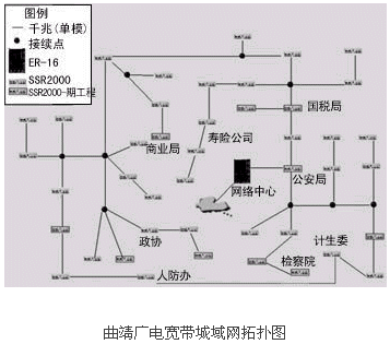 網(wǎng)絡建設的第一期工程結束后,本地多媒體寬帶骨干網(wǎng)以曲靖市政府內的機房作為中心機房。核心機房采用支持千兆以太網(wǎng)、SDH及ATM接口的高檔交換式路由器ER-16。主干光纖沿市區(qū)鋪設成為一個星形鏈路,以便在不久的將來能夠將計生委和人防辦的光纖連接起來形成一個環(huán)狀鏈路。市區(qū)內共設43個光節(jié)點,各鄉(xiāng)鎮(zhèn)有一個光節(jié)點,以92條單模光纖直接連入核心機房的交換式路由器,由此與核心機房形成一個星狀拓撲結構。