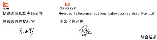 屆時,不僅有Genesys全球總裁率領(lǐng)資深專家向您介紹客戶關(guān)系管理領(lǐng)域的市場動向與未來趨勢,還帶來了全球拭目以待、發(fā)熱發(fā)光的Genesys最新產(chǎn)品 ── G7。此外主辦單位更有幸請來兩岸三地知名客戶,提供商務(wù)應(yīng)用實例,共同分享其成功經(jīng)驗,為您的企業(yè)及同行業(yè)提供了相互交流的機會。