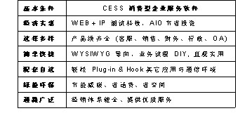 CESS消費型服務(wù)軟件具有經(jīng)濟實惠、選擇多樣、簡單快捷、配套自選、綠能環(huán)通路廣泛等特點,采用Web+IP的潮流科技,AIO節(jié)省投資,使軟件經(jīng)濟實惠;CESS軟件產(chǎn)品線齊全,涵蓋客服、銷售、財務(wù)、行政、OA等很多方面,給您多樣選擇;WYSIWYG(所見即所得)導(dǎo)向,業(yè)務(wù)流程DIY,讓您至需要動動鼠標(biāo)就可以DIY您想要得到的設(shè)計,不再需要麻煩IT人員,只管實用,簡單快捷;輕松Plug-in & Hook其它應(yīng)用與通信環(huán)境,可根據(jù)您的需要配套自選;節(jié)能減碳、省話費、省空間,綠色環(huán)保;經(jīng)銷體系健全、提供優(yōu)質(zhì)服務(wù),通路廣泛。