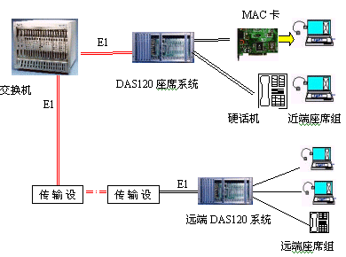 見(jiàn)下圖:DAS120主機(jī)通過(guò)4個(gè)E1接口與交換機(jī)直接連接,可方便地實(shí)現(xiàn)本地座席接入。遠(yuǎn)端分布式接入則需要通過(guò)傳輸設(shè)備,它們可為光纖,微波,HDSL等。終端可為座席卡和電話機(jī)。