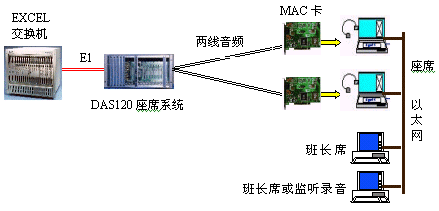 DAS120與億景座席卡MAC配合使用,可使系統(tǒng)的優(yōu)越性發(fā)揮到最大。MAC卡提供的強(qiáng)大功能(收發(fā)DTMF和450HZ信號(hào)音,語(yǔ)音錄放等)有效地簡(jiǎn)化系統(tǒng)軟件的設(shè)計(jì),并可降低系統(tǒng)成本,如EXCEL交換機(jī)可不用配置DSP卡,IVR可簡(jiǎn)化等。還可以有效地降低交換機(jī)的處理負(fù)荷,提高話務(wù)處理能力。