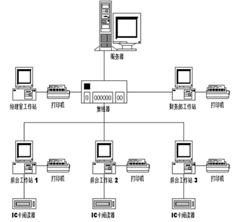 系統(tǒng)由IC卡閱讀器、工作站、服務(wù)器、打印機(jī)、相應(yīng)網(wǎng)絡(luò)及管理軟件組成。由工作站接收IC卡閱讀器的客戶數(shù)據(jù)并輸入消費(fèi)業(yè)務(wù)數(shù)據(jù),通過網(wǎng)絡(luò)保存到服務(wù)器。
