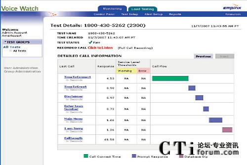 Voice Watch 監(jiān)測(cè)系統(tǒng)可以管理全球散布的Empirix Hammer系統(tǒng)每隔15分鐘自動(dòng)撥入被測(cè)的呼叫中心,并在通話期間測(cè)試各種指標(biāo)。