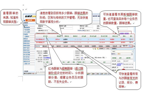 2、通過軟件對跟單的業(yè)務(wù)進(jìn)展記錄固化,清晰掌握該跟單由誰創(chuàng)建、誰去談單、報(bào)價有無競爭對手、有無難點(diǎn)等進(jìn)展一覽無余,避免了傳統(tǒng)的電話、面對面溝通。
