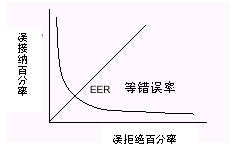 這些錯(cuò)誤和兩種不同的用戶(hù)群有關(guān)。特別是,比如,0.2%的誤接納率,并不意味著0.2%的呼叫者能闖入系統(tǒng),而是0.2%的冒名頂替者企圖闖入。這比例往往只是呼叫者總數(shù)的一個(gè)零頭。安全性和方便性須得到折衷平衡。當(dāng)誤接納率接近零時(shí),誤拒絕率則上升,反之亦然。曲線(xiàn)上誤接受和誤拒絕率相等的點(diǎn)叫等錯(cuò)率(ERR)。
