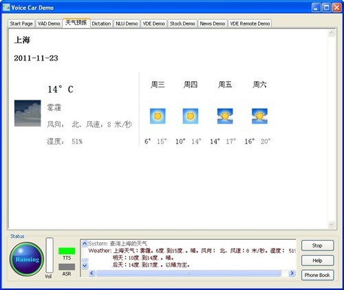 比方說這個關(guān)于空調(diào)問題,我們過去,空調(diào)的命令詞是“把空調(diào)打開,空調(diào)溫度提高3度!爆F(xiàn)在我也可以這樣說,空調(diào)調(diào)高一點,我有點冷,也可以。就是你在車?yán)镞呁耆梢杂媚阕约旱恼Z言來說你想干的事。比如說,前邊你不知道明天天氣會怎么樣,人一般都會想想,明天天氣如何,或者是告訴我天氣預(yù)報。但是你也可以這樣說。明天會下雨嗎?也可以這樣說;蛘吣氵@樣說,你說,今天大盤怎么樣。完全是用自然語言來說。堵不堵車,“查詢交通情況。”這就是,實際上可以有各種不同的說法來完成這個任務(wù),這是我們自然語言的一個演示。