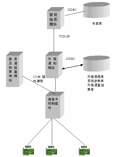 北京市建筑市場(chǎng)專(zhuān)家評(píng)標(biāo)抽取通知系統(tǒng)是靈訊科技有限公司采用加拿大Eicon網(wǎng)絡(luò)公司的Diva Server 4BRI 卡開(kāi)發(fā)的一套高效的外撥通知系統(tǒng),該系統(tǒng)充分體現(xiàn)了Eicon網(wǎng)絡(luò)公司 Diva Server 4BRI卡強(qiáng)大的語(yǔ)音功能以及系統(tǒng)的穩(wěn)定性,準(zhǔn)確地識(shí)別了外撥手機(jī)的遇忙、無(wú)人、不再服務(wù)區(qū)、關(guān)機(jī)、空號(hào)等狀態(tài),實(shí)現(xiàn)了對(duì)手機(jī)狀態(tài)的全面監(jiān)控,全面解決了模擬語(yǔ)音卡對(duì)外撥手機(jī)信號(hào)無(wú)法判斷的問(wèn)題。具體的系統(tǒng)架構(gòu)如下:Eicon公司供稿 CTI論壇編輯