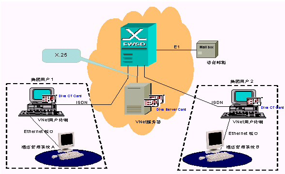 圖中集團用戶1與集團用戶2內(nèi)部使用了配置Eicon 公司Diva CT Card的Vnet系統(tǒng)用戶終端,同時接入ISDN設(shè)備與EWSD交換機連接,信號通過EWSD交換機響應(yīng)給配置Eicon