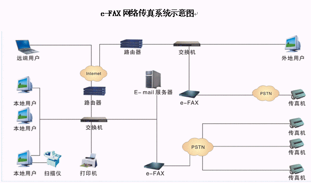 e-FAX網(wǎng)絡(luò)傳真機 的工作原理是利用內(nèi)部設(shè)備對傳真和語音信號的存儲及轉(zhuǎn)換功能,在網(wǎng)絡(luò)配置許可的范圍內(nèi) , 主要實現(xiàn)了自動接收和發(fā)送傳真的功能。系統(tǒng)內(nèi)用戶能通過電子郵件和網(wǎng)頁方式收取自己的傳真或語音,發(fā)送傳真時只需要提交傳真給傳真服務(wù)器,服務(wù)器能自動發(fā)送。系統(tǒng)外用戶能在語音流程的提示下發(fā)送或接收傳真,也可以選擇發(fā)送留言信息。系統(tǒng)管理員則可以對系統(tǒng)進行參數(shù)配置,流程定制和用戶信息管理等功能操作。